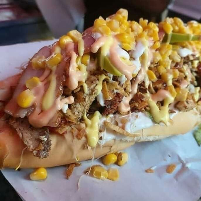 Pan Francés Jumbo, Trozos de Carne, Pollo y Chorizo a la plancha con delicioso sazón casero, Tocineta, Papita cabello de ángel, Queso rallado, Vegetales frescos, Maíz, Salsas de la casa más bebida