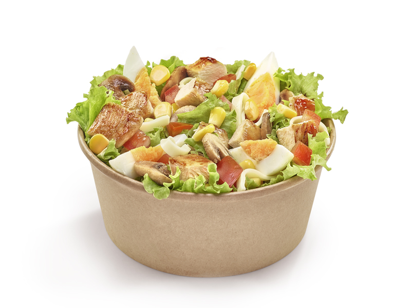 Con filete de pollo en cubos, lechuga crespa, maicitos, tomate en trozos, champiñones salteados, tiras de queso mozzarella y huevo cocinado, acompañada con salsa.