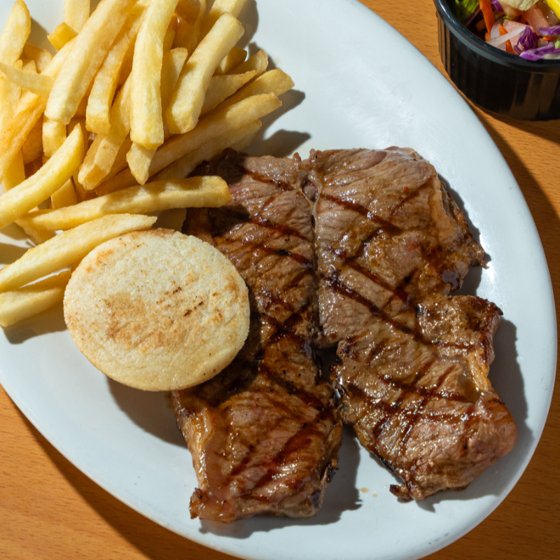 Chatas de res de 200g, acompañada de papa francesa, arepita y ensalada.