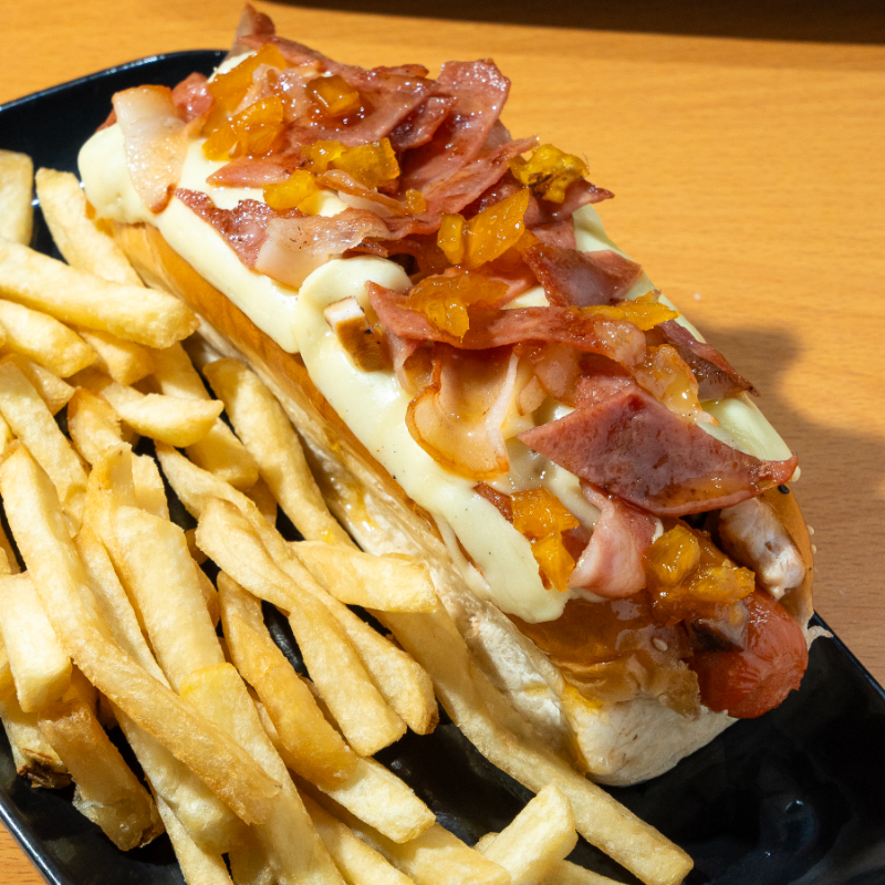 Perro con salchicha americana , picadito res y pechuga, tocineta, piña caramelizasa, queso y papas a la francesa