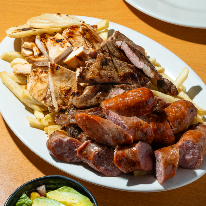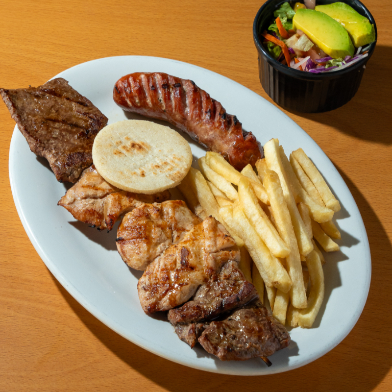 Combinación de carne de res, pechuga y chorizo al carbón, con papa francesa, arepitas y ensalada.