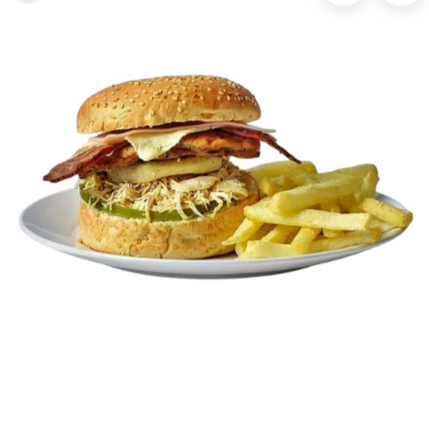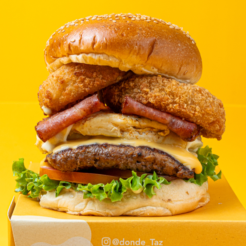 Hamburguesa pechuga 120g, jamón, tocineta, pollo desmechado, vegetales, queso y salsa tártara. Acompañada de papas a la francesa.