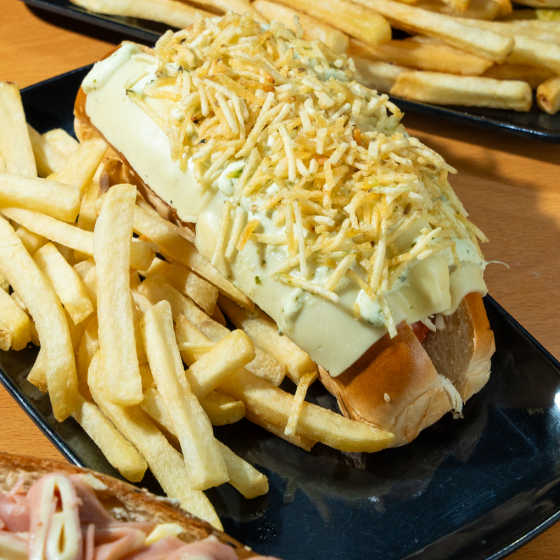 Perro con salchicha americana, pollo desmechado, cebolla, queso doble crema, tártara y papas a la francesa.