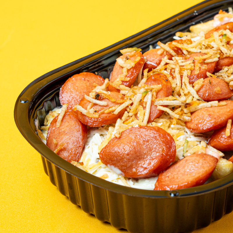 Papa francesa y salchicha americana picada. Acompañado de salsa tártara, piña y rosada, queso rayado y papa ripido.