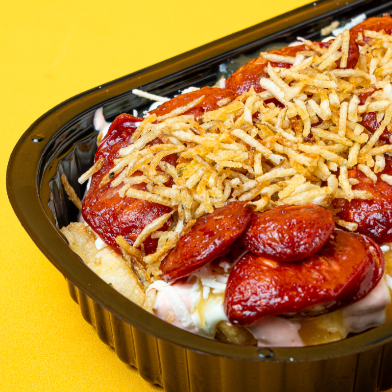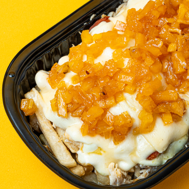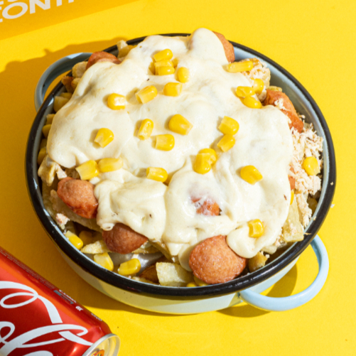 Papa francesa , pollo desmechado , salchicha americana, tocineta, queso doble crema, con adiciones de la casa y salsas artesanales.