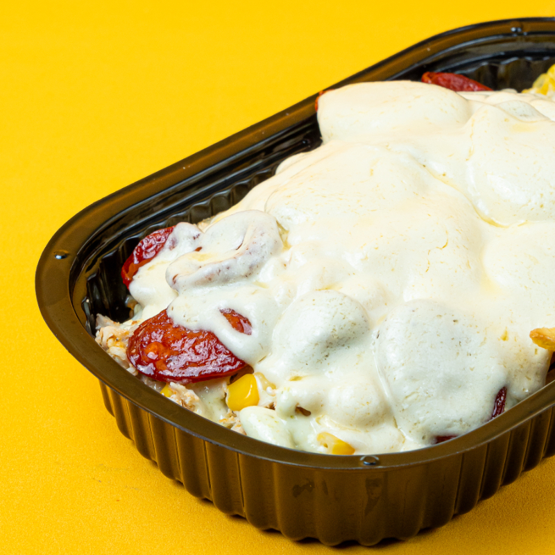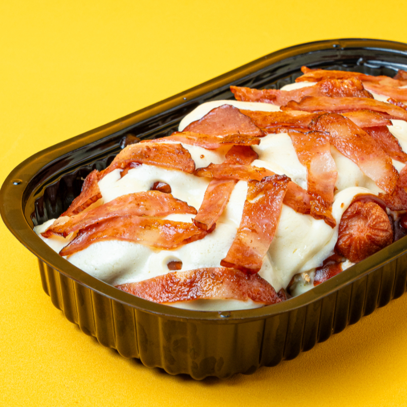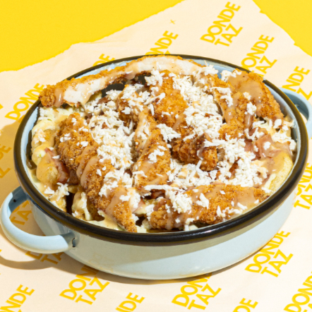 Papa francesa, strips de pechuga fritos, queso semisalado, tocineta crispy, queso doble crema, salsa tártara y salsa dinner.