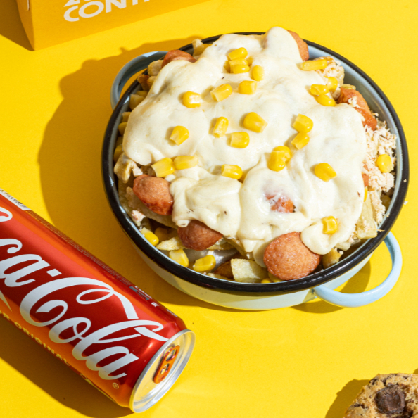 Papas Taz Pq + Gasesosa 250 ml. Papa Francesa, salchicha zenú, pollo desmenuzado, maíz dulce, queso gratinado y salsa tártara.