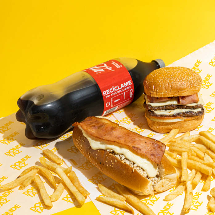 1 hamburguesa fantaztica + 1 perro fantaztico, 2 porciones de papas francesa y gaseosa lt