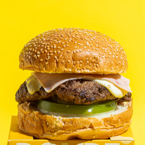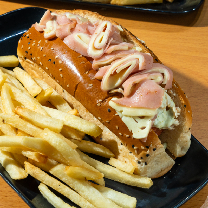 Hamburguesa con carne de 120g, queso doble crema, jamón, vegetales y salsa tártara. Acompañada de papas a la francesa.