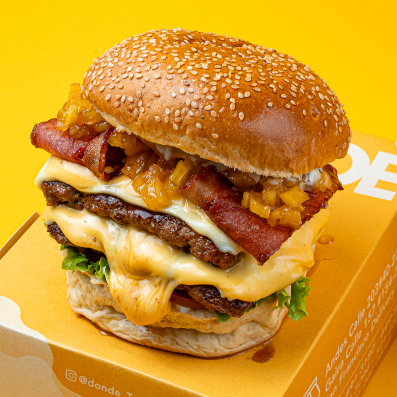 Hamburguesa doble carne 120 g, tocineta, queso cheddar, queso doble crema, piña en cuadros, lechuga, tomate y salsa tártara. Acompañada de papas a la francesa.