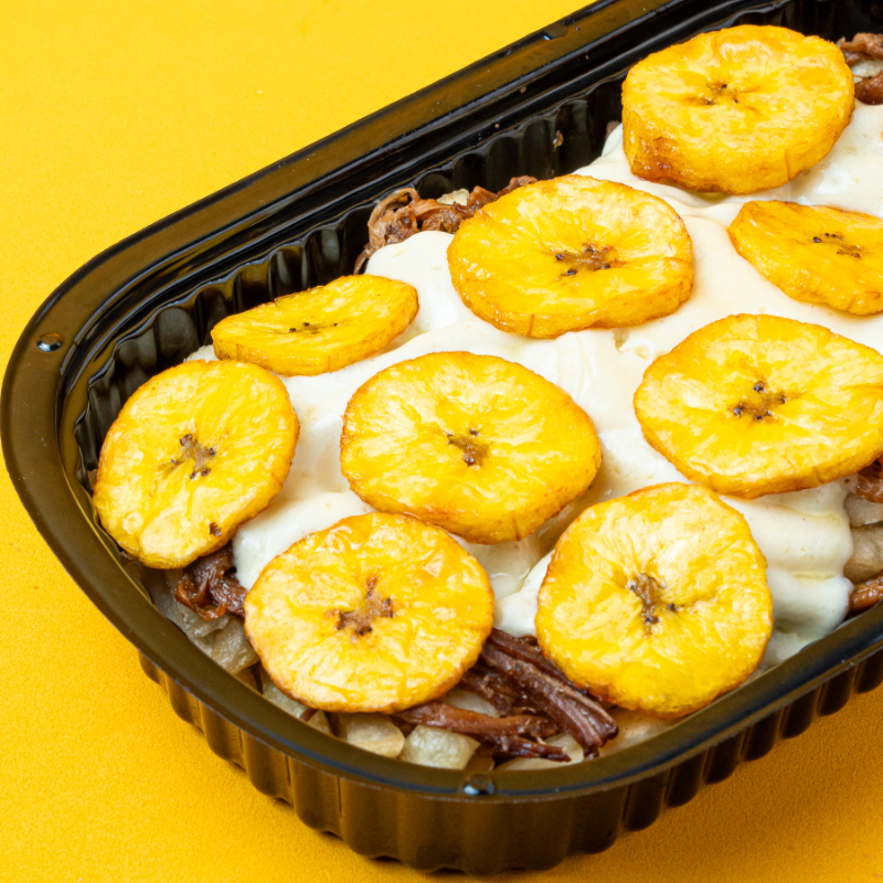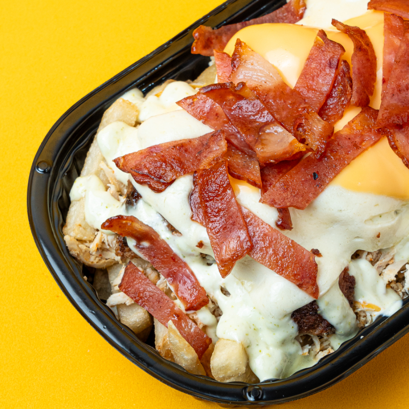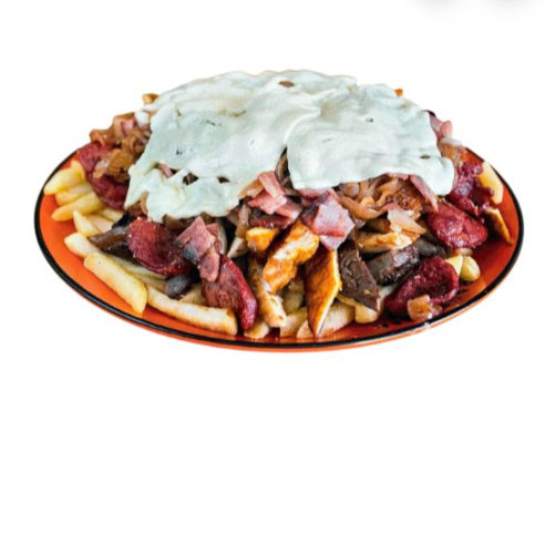 Papa francesa , pollo desmenuzado, carne de hamburguesa tocineta crispy, queso doble crema, con adiciones de la casa y salsas artesanales.