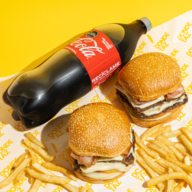 2 burger mixta + 1 gaseosa lt: Combinación de carne de res y pollo, con queso, tocineta, vegetales y papa francesa.