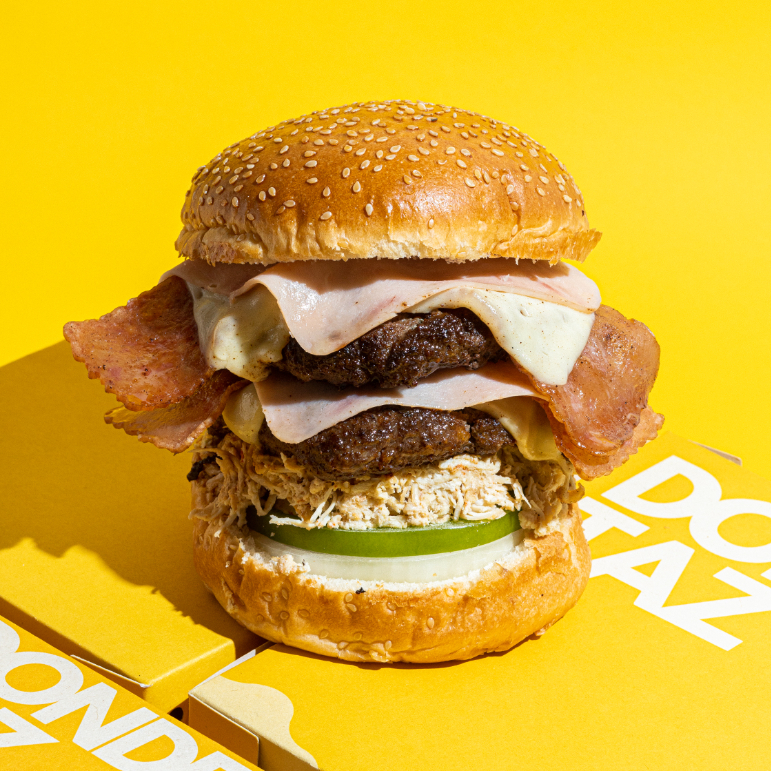 Combinación doble carne 120gr, jamón, queso, tocineta, pollo desmechado, vegetales y papa francesa.