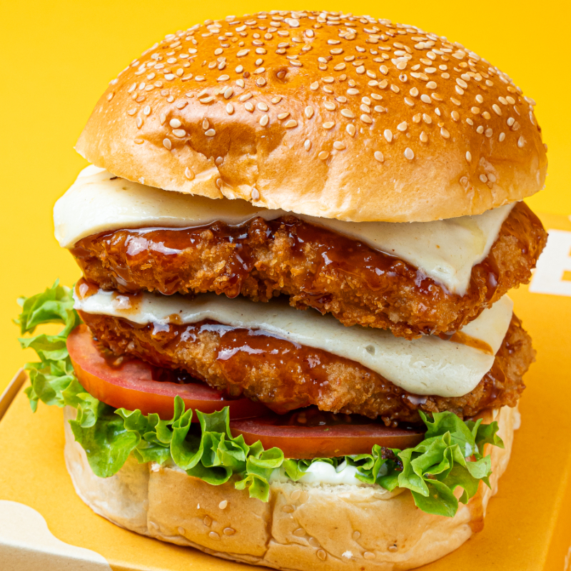 Hamburguesa doble filete de 120g apanado en panko, con queso doble crema, lechuga, tomate, salsa bbq y tártara. Acompañada de papas a la francesa.