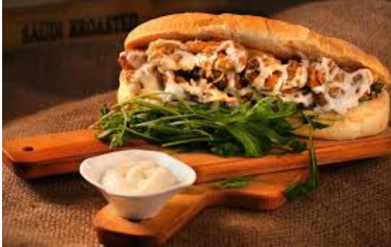 Pan brioche, queso, lechuga, plátano maduro, pollo desmechado.