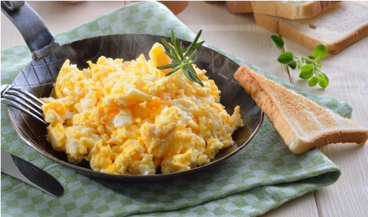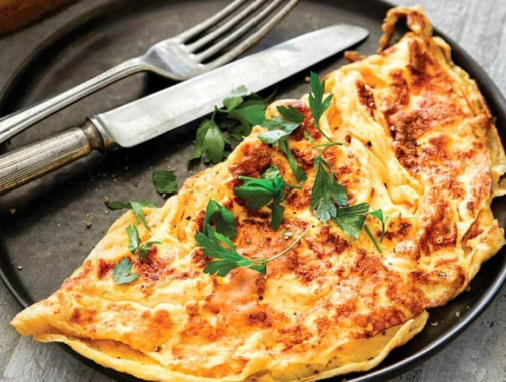 Tradicional huevo en tortilla con queso acompañado de pan.