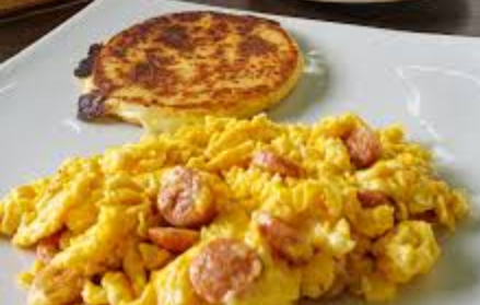 Tradicional huevos con salchicha y jamón acompañado de arepa.
