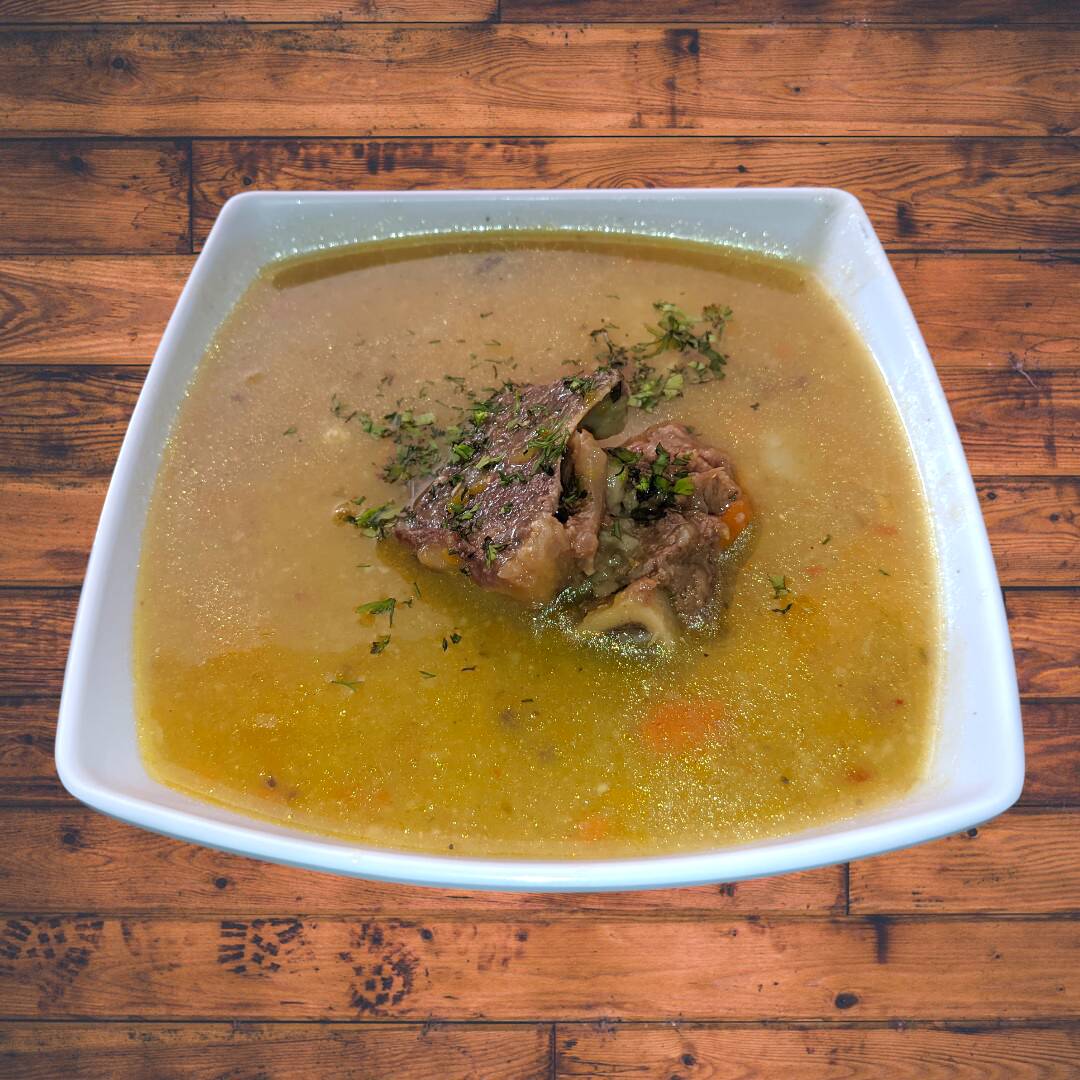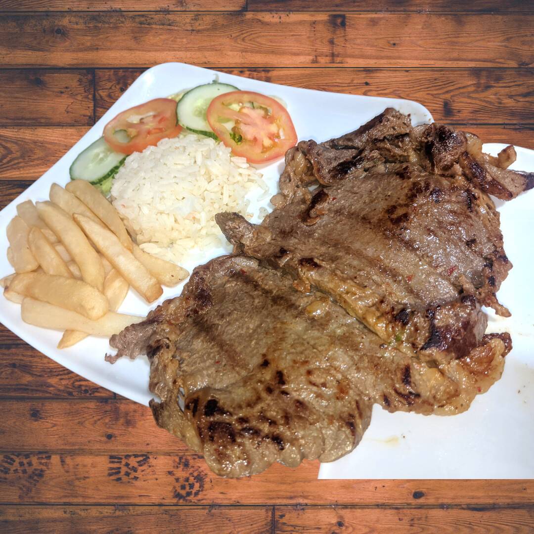 Deliciosa Carne Asada a la plancha, jugosa y al punto. Acompañada de: Rica sopa del dia, Arroz, Papas A La Francesa, Ensalada y Jugo.