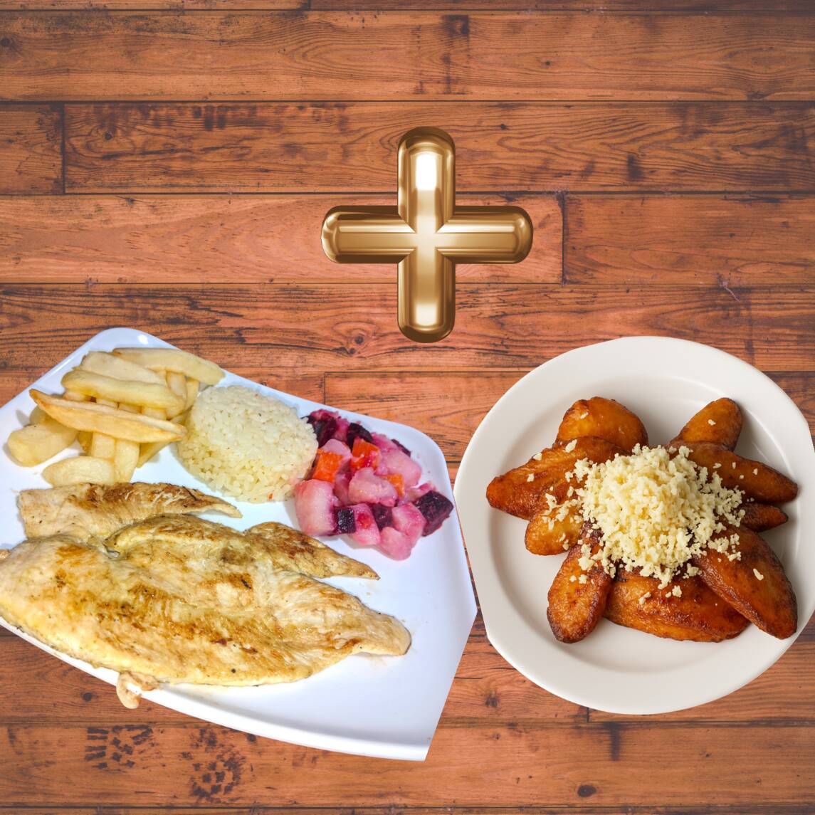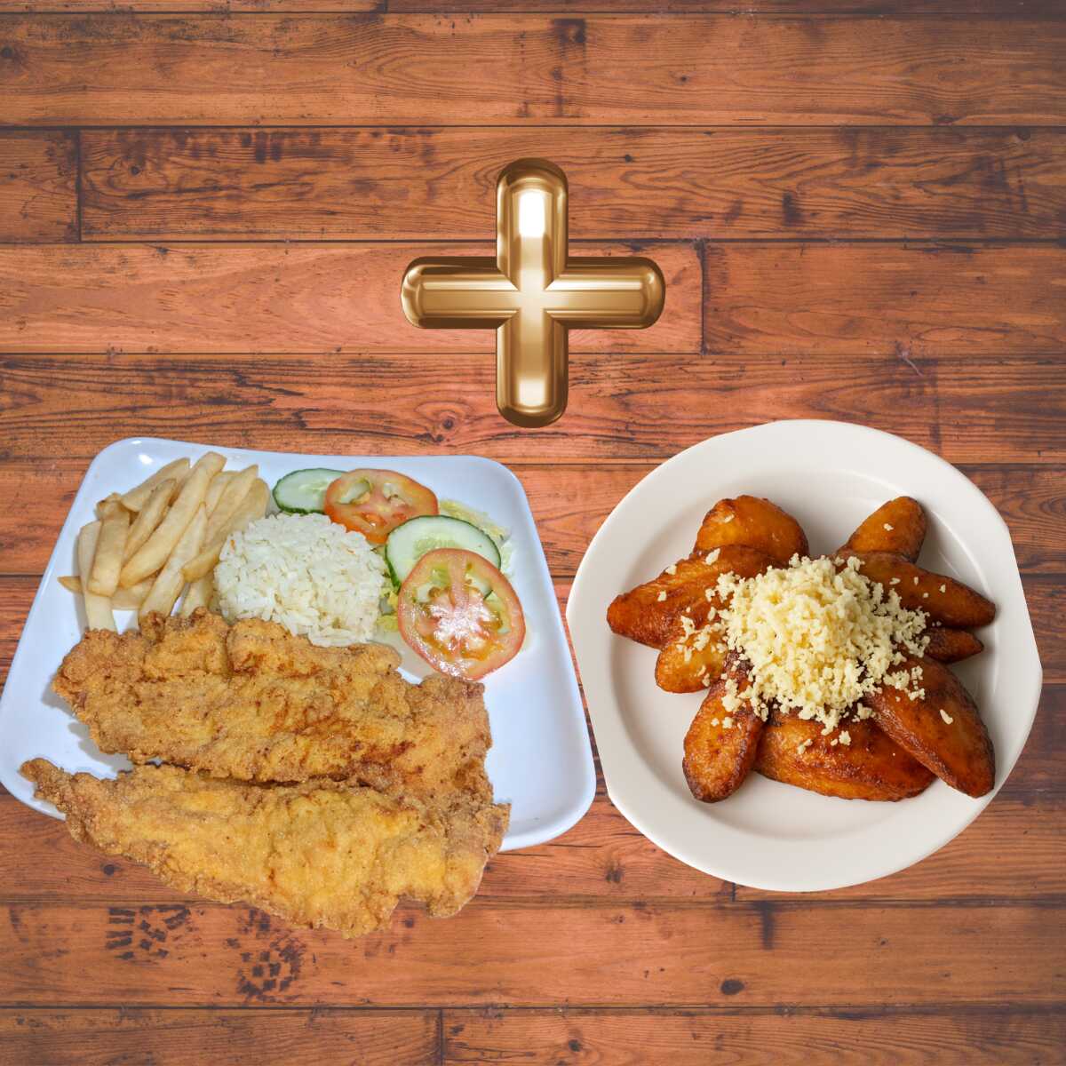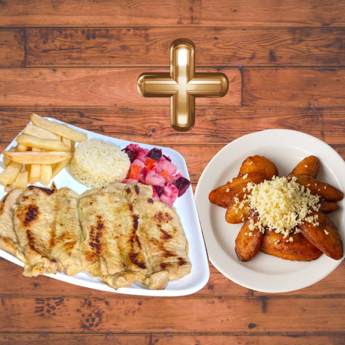 Pechuga de Pollo Apanada y marinada en nuestro condimento de la casa y Tajadas de maduro con queso!!. Crujiente por fuera y jugosa por dentro. Acompañada de: Rica sopa del dia, Arroz, Papas A La Francesa, Ensalada y Jugo. Mas tajadas de maduro con queso rallado!!