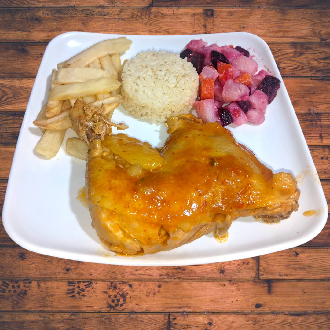 Pierna Pernil de Pollo sudado en salsa casera. Acompañada de: Rica sopa del dia, Arroz, Papas A La Francesa, Ensalada y Jugo.