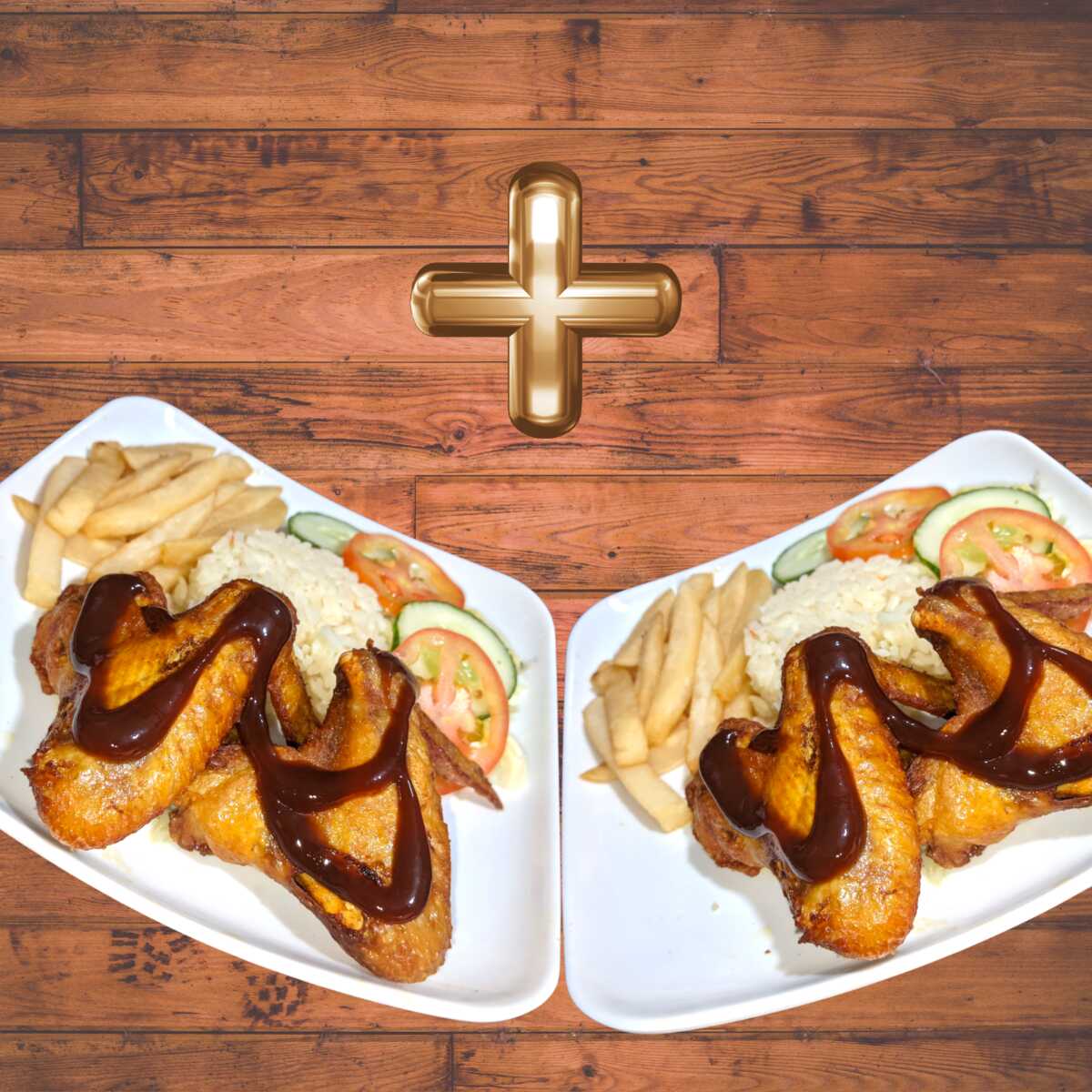 Dos almuerzos con Alitas Crocantes Bañadas en salsa BBQ. Acompañada de: Rica sopa del dia, Arroz, Papas A La Francesa, Ensalada y Jugo.