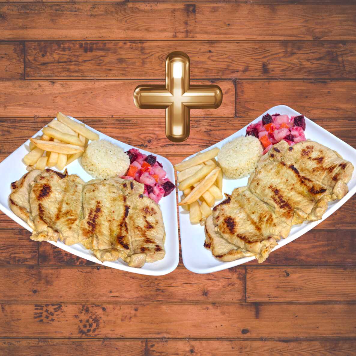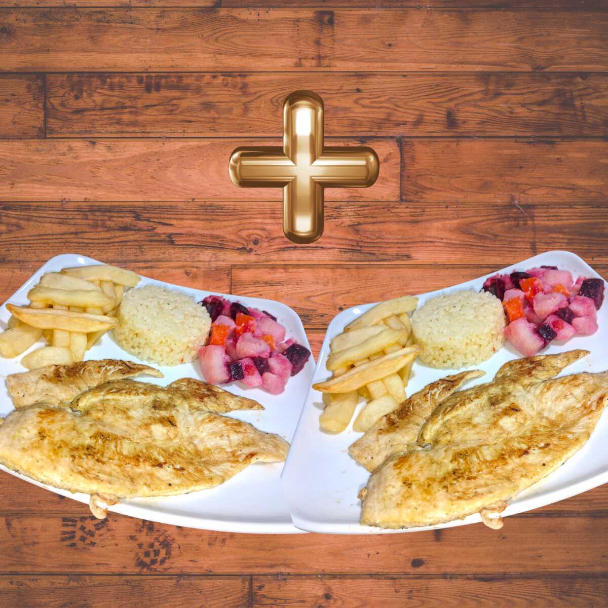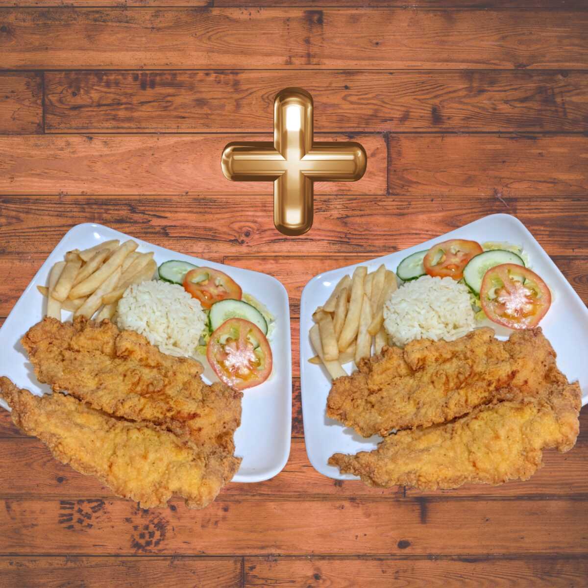 Dos almuerzos con Pechuga de Pollo Apanada y marinada en nuestro condimento de la casa. Crujiente por fuera y jugosa por dentro. Acompañada de: Rica sopa del dia, Arroz, Papas A La Francesa, Ensalada y Jugo.