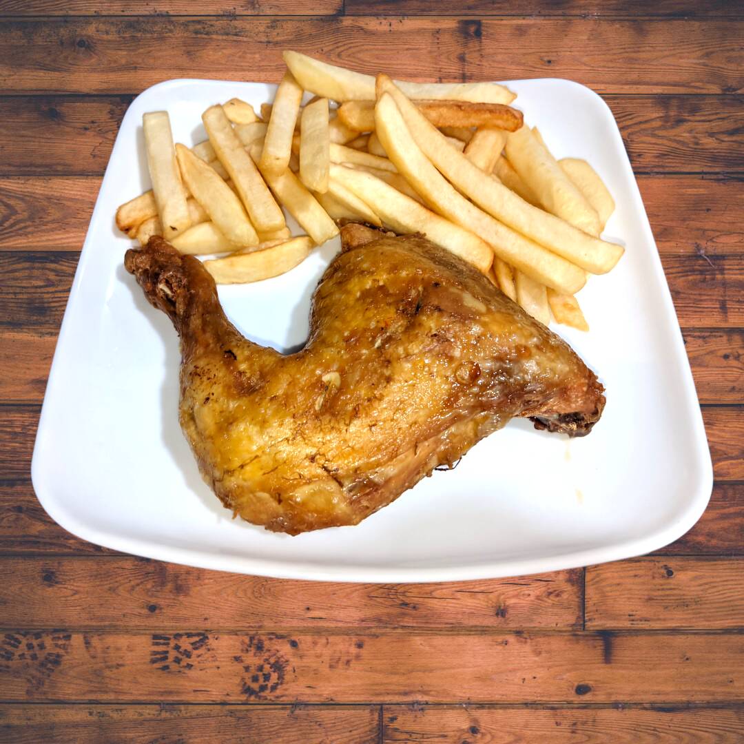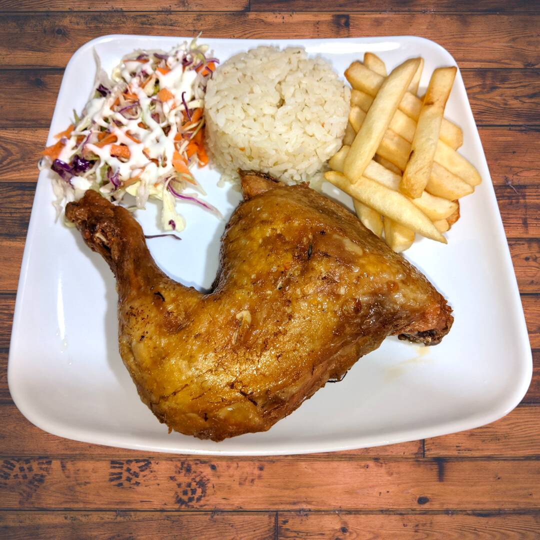 Pierna Pernil de Pollo, crujiente por fuera y jugoso por dentro. Acompañada de: Rica sopa del dia, Arroz, Papas A La Francesa, Ensalada y Jugo.