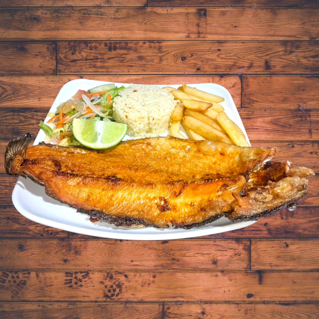 Trucha Frita, fresca y ligera. Acompañada de: Rica sopa del dia, Arroz, Papas A La Francesa, Ensalada y Jugo.