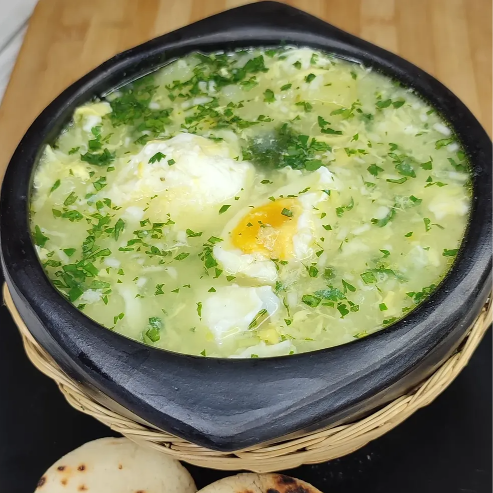 Caldo de huevo con arepa (Blanca o amarilla) papa, tostado, cilantro y tinto o café en leche.