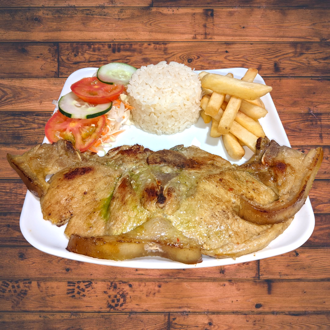 Chuleta de Cerdo (200g) dorada y bien sazonada. Acompañada de: Rica sopa del dia, Arroz, Papas A La Francesa, Ensalada y Jugo.