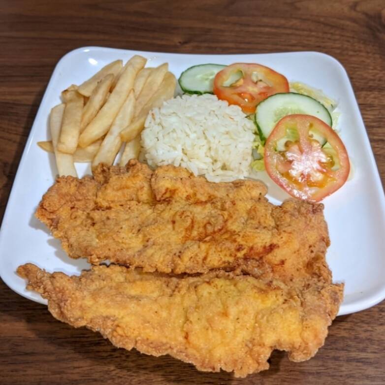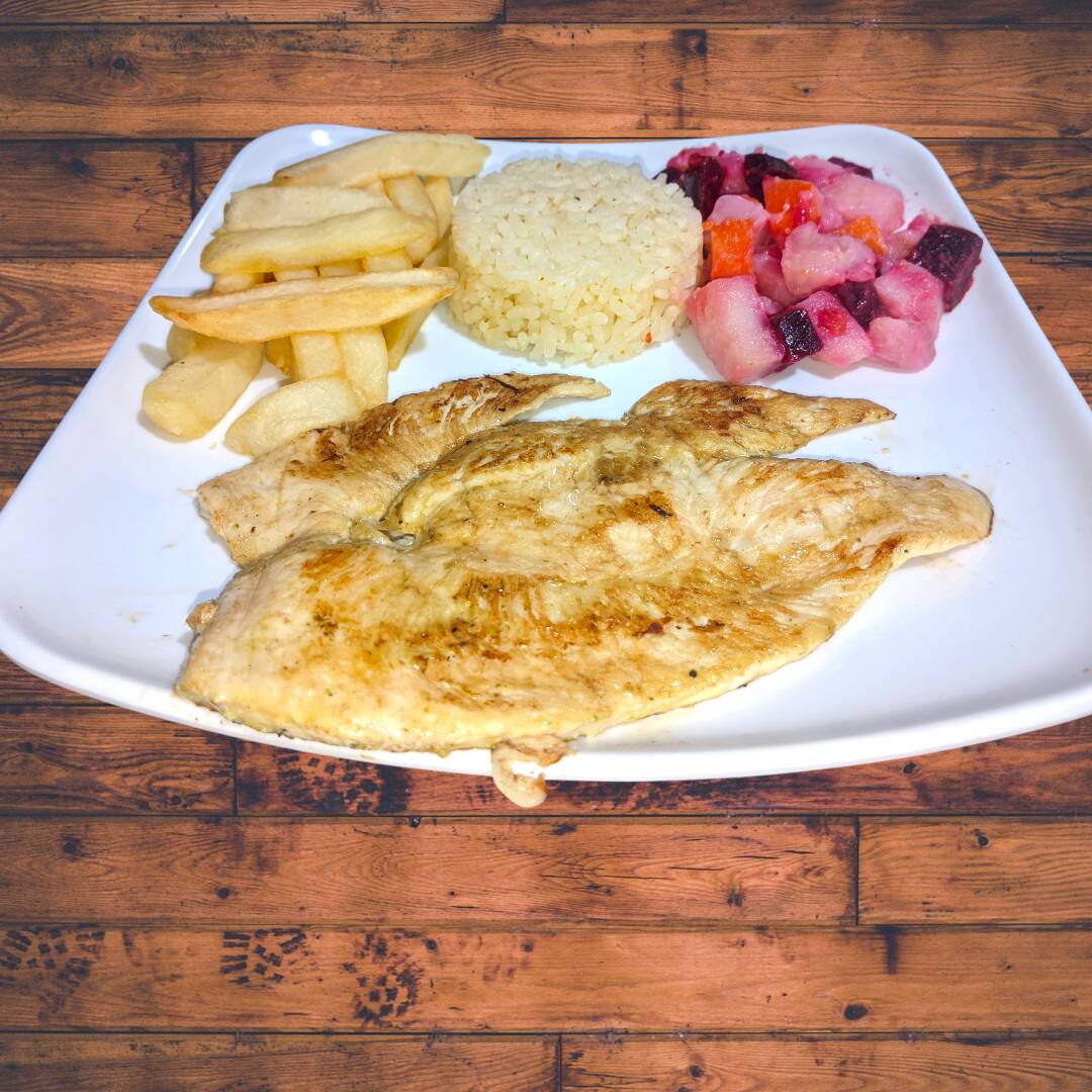Pechuga de Pollo Apanada y marinada en nuestro condimento de la casa. Crujiente por fuera y jugosa por dentro. Acompañada de: Rica sopa del dia, Arroz, Papas A La Francesa, Ensalada y Jugo.