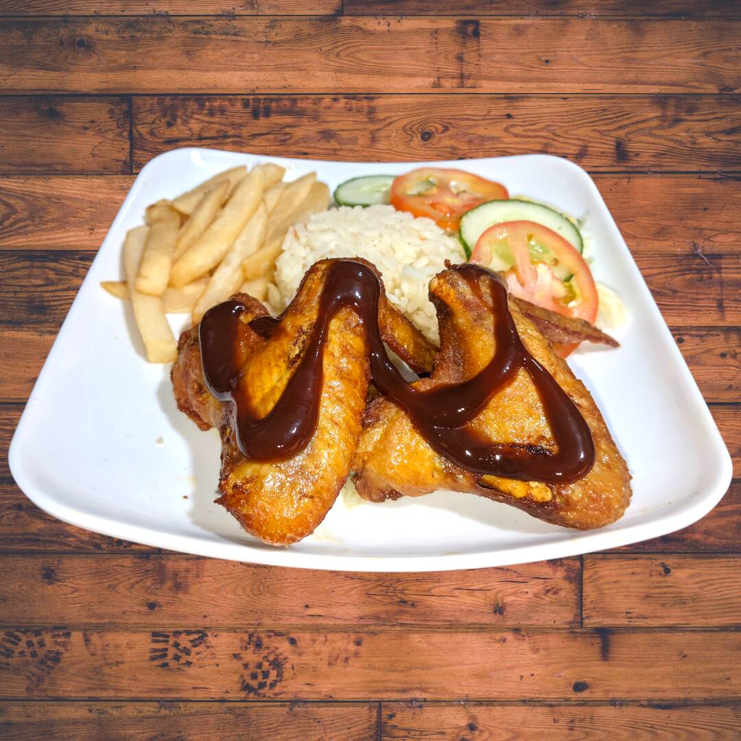 Alitas Crocantes Bañadas en salsa BBQ. Acompañada de: Rica sopa del dia, Arroz, Papas A La Francesa, Ensalada y Jugo.