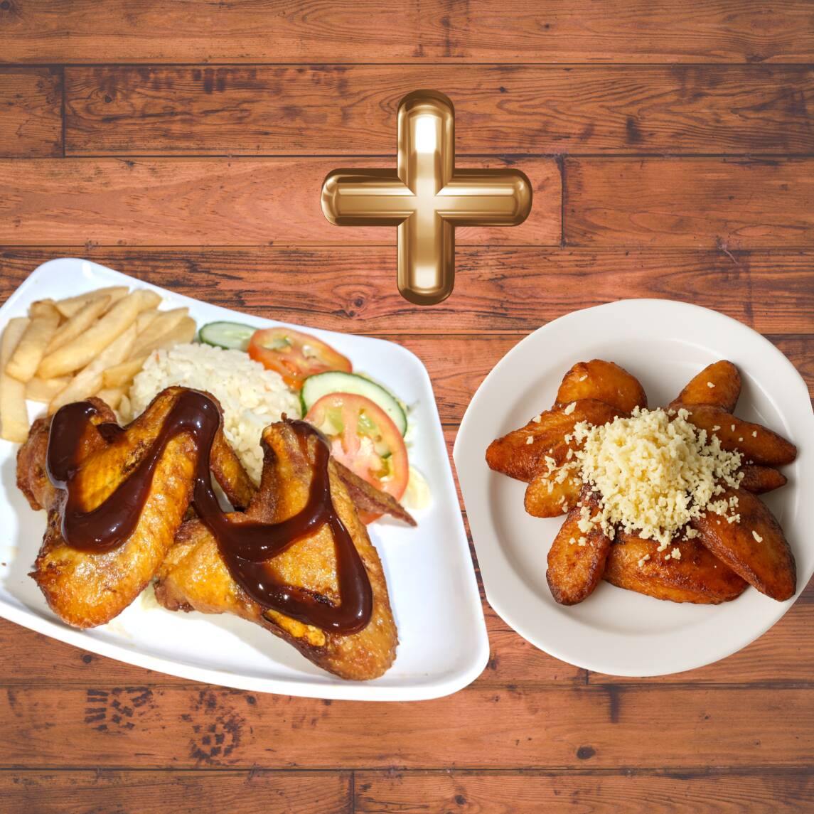 Alitas Crocantes bañadas en salsa BBQ y Tajadas de maduro con queso!!. Acompañada de: Rica sopa del dia, Arroz, Papas A La Francesa, Ensalada y Jugo