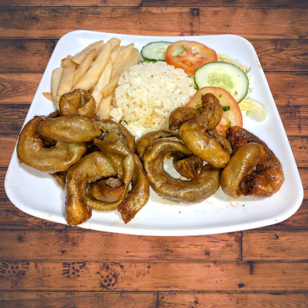 Chunchulla crocante al estilo parrilla. Acompañada de: Rica sopa del dia, Arroz, Papas A La Francesa, Ensalada y Jugo.