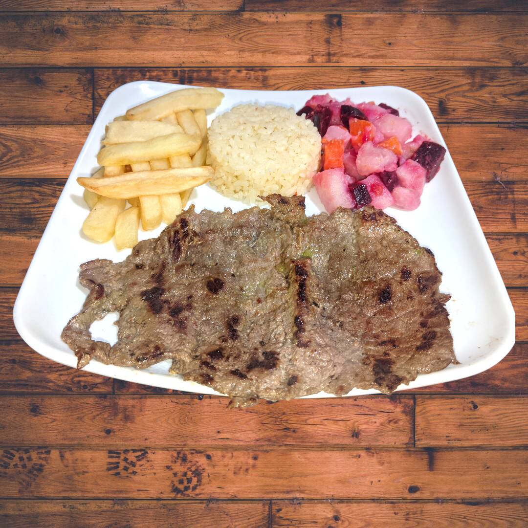 Corte de Res (200g) a la Parrilla, jugoso y lleno de sabor. Acompañada de: Rica sopa del dia, Arroz, Papas A La Francesa, Ensalada y Jugo.