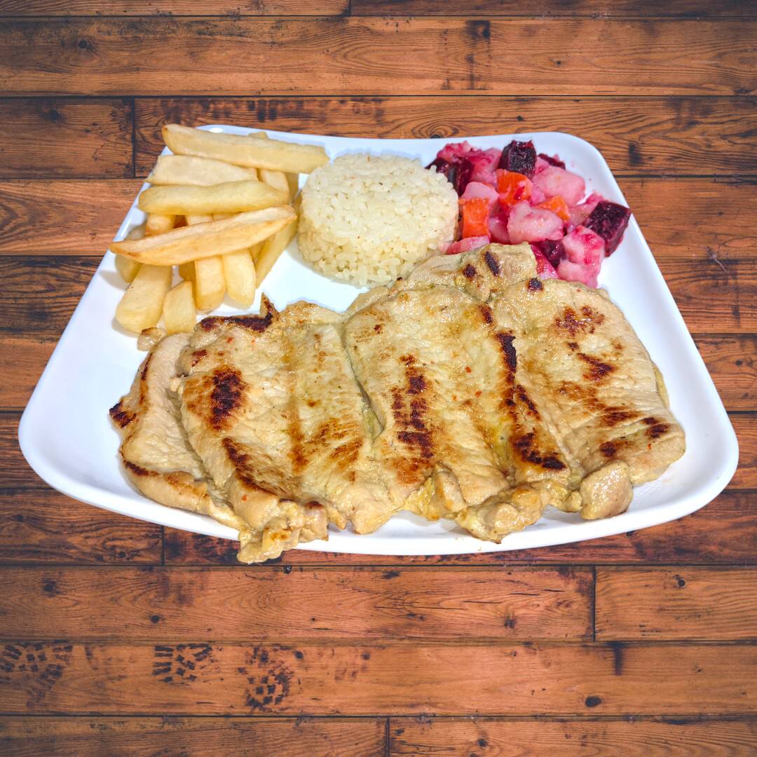 Corte De Cerdo a la plancha con sabor tradicional. Acompañado de: Rica sopa del dia, Arroz, Papas A La Francesa, Ensalada y Jugo.