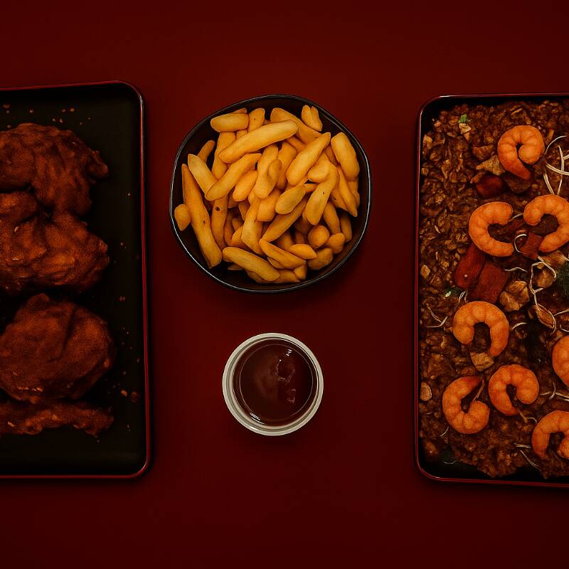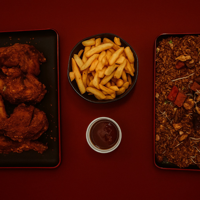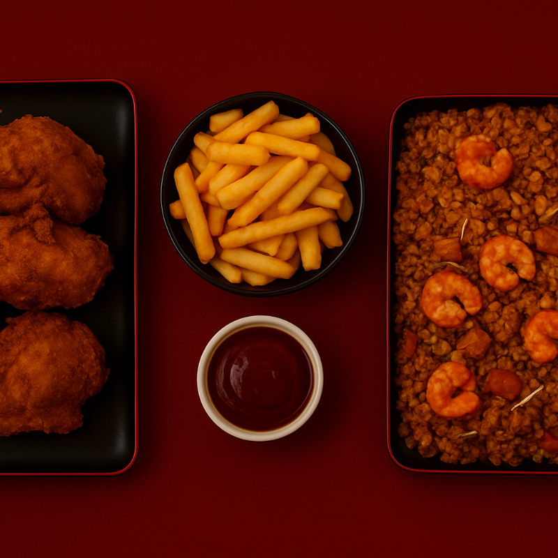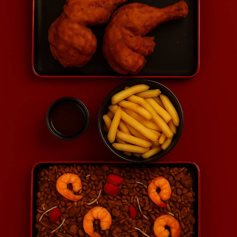 3 Perniles completos, arroz chino oriental 3 carnes (pollo, carne y jamón) y papa francesa, suficiente para 3 personas.