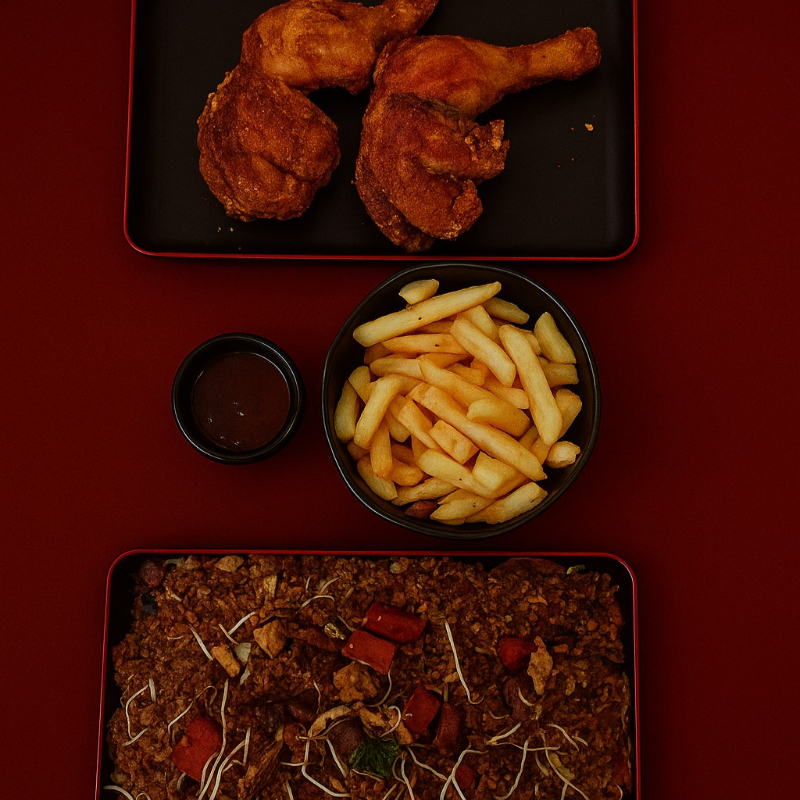 2 Perniles completos, arroz chino oriental 3 carnes (pollo, carne y jamón) y papa francesa suficiente para 2 personas.