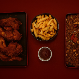 4 Perniles completos, arroz chino 3 carnes (pollo, carne y jamón) y papa francesa, suficiente para 4 personas.
