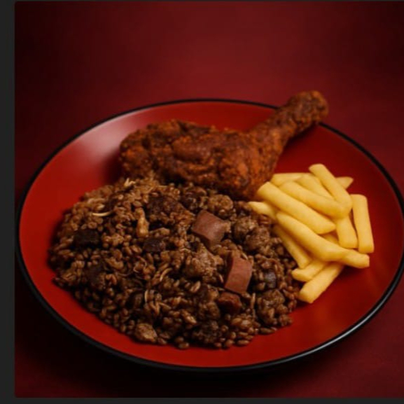 1 Pernil completo, arroz chino 4 carnes (carne, pollo, jamón y camarón) y papa francesa, suficiente para 1 persona.