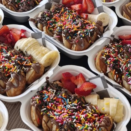 Waffle completo 4 porciones fresas + banano + mango incluye lechera y granola