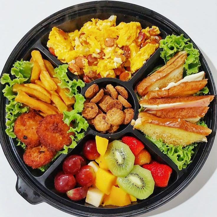 Fruta picada (manzana, mango, banano, fresas) + sandwich (jamón queso y vegetales) + Huevos revueltos con salchicha+ mini donas con topping /// acompañado jugo de naranja + moño