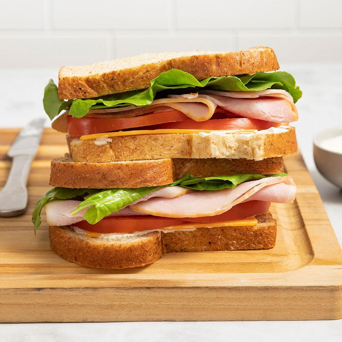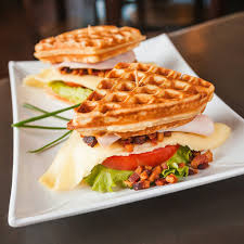 Dos porciones de waffle con queso, jamon y vegetales + queso crema