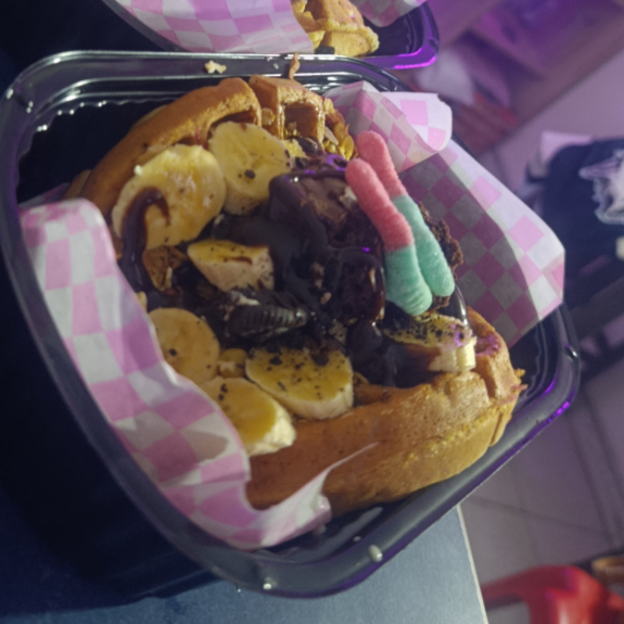 Waffle completo 4 porciones con salsa de chocolate galletas oreo y trozos de chocolate y chispas
