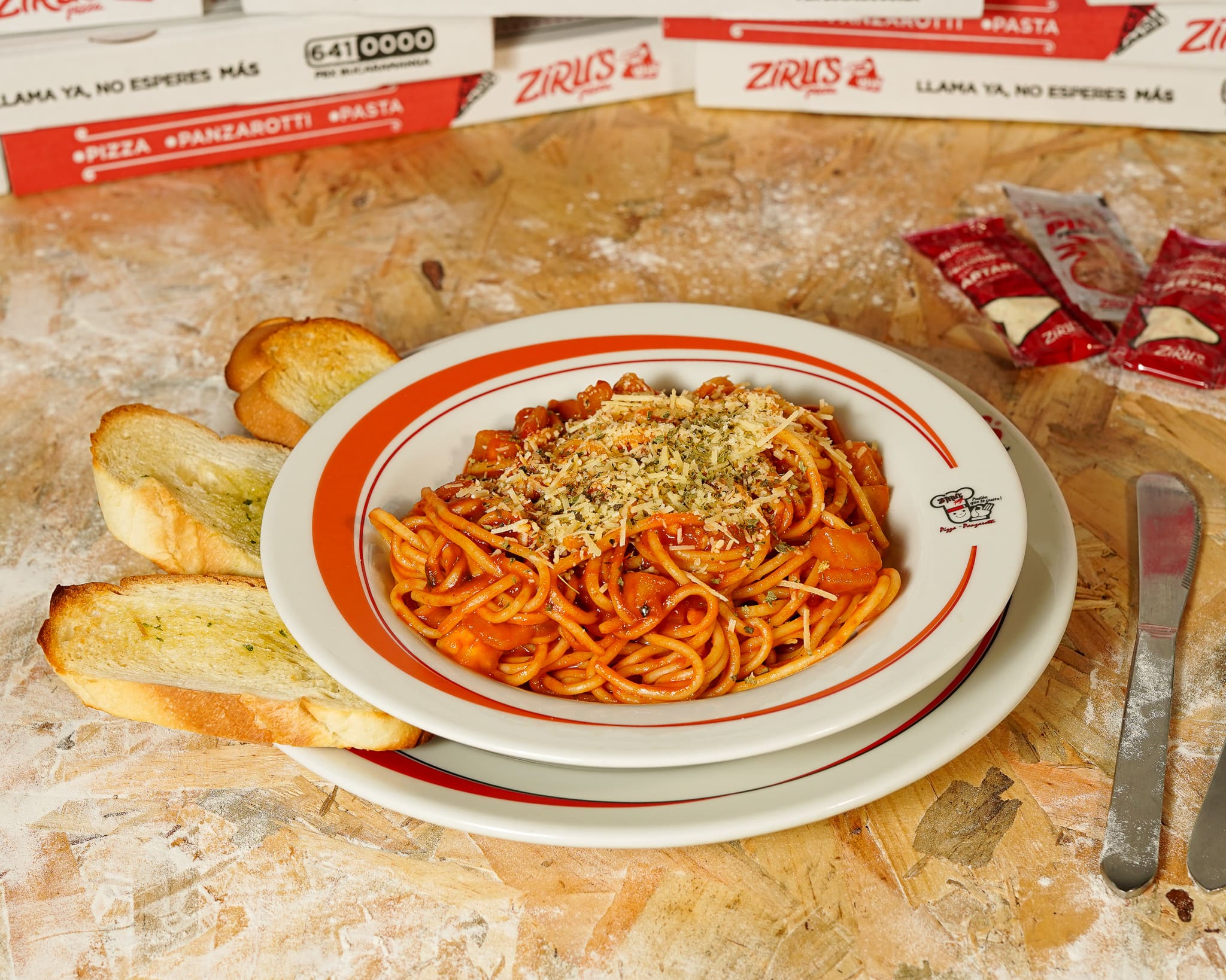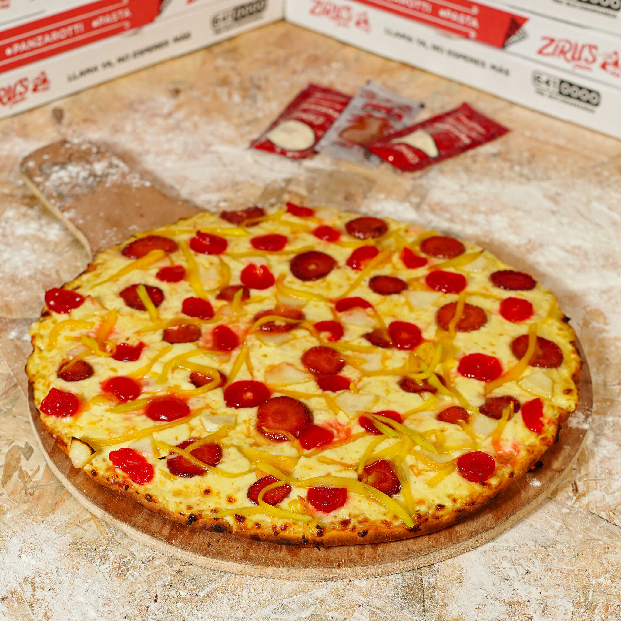 Pizza en masa artesanal, queso mozarella, pepperoni y nuestra salsa Zirus.