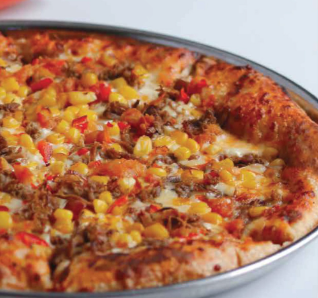 La reina de la casa, variedad de carnes, salami, champiñones horneados, cábano, pollo desmechado, pimentón y cebolla, queso mozzarella, masa tradicional Ziru´s y salsa de la casa.