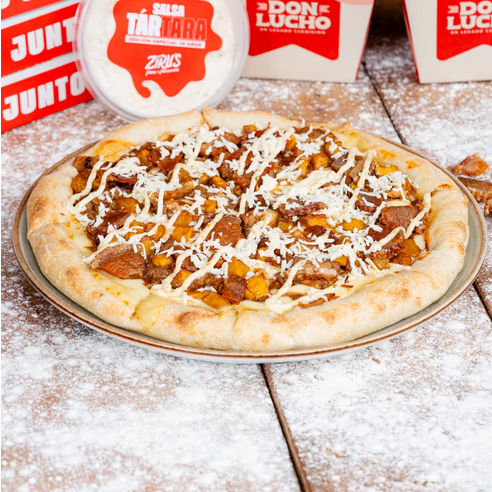Masa artesanal con salsa base, 6 porciones diámetro 20 cm queso mozarella, pollo desmechado, chorizo, tocino, maíz, piña, lechuga, queso costeño, salsa de ajo y papas fosforito. ¡Sabor callejero irresistible!