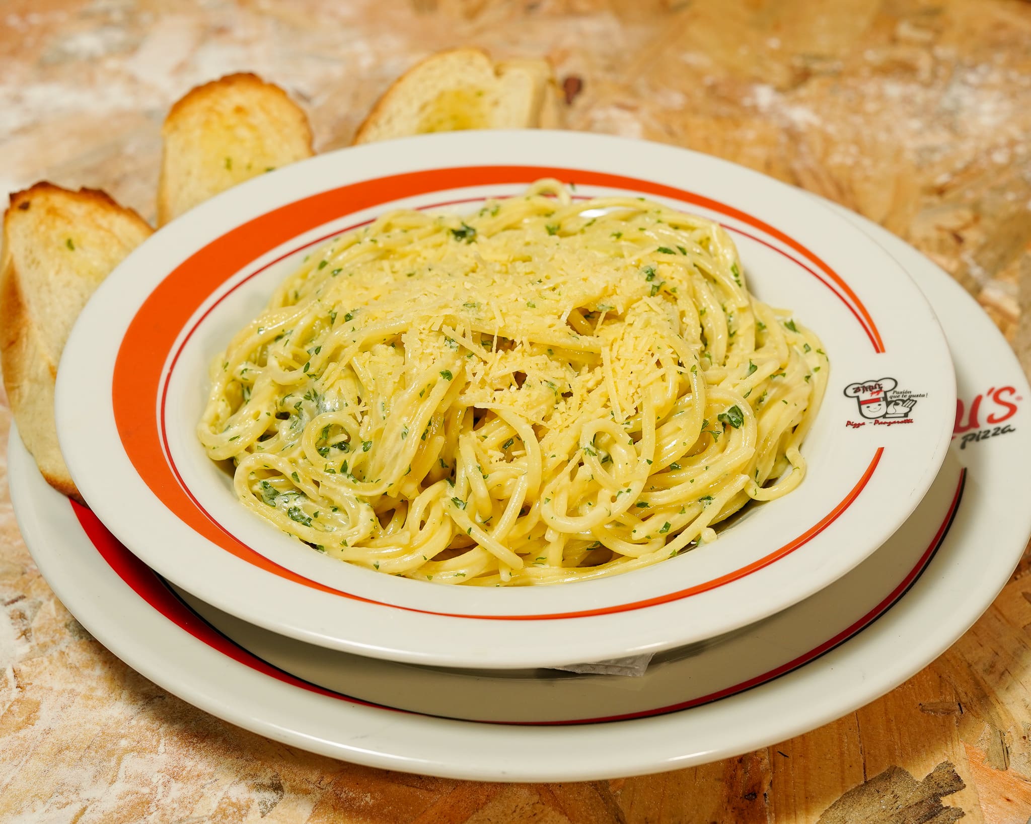 Combinación de pollo de la casa, tocineta, champiñón, cebolla salteada, en nuestra salsa blanca Ziru´s, acompañado de pan de ajo..