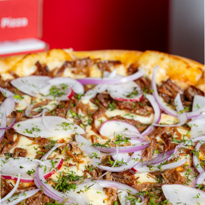 La reina de la casa, variedad de carnes, salami, champiñones horneados, cábano, pollo desmechado, pimentón y cebolla, queso mozzarella, masa tradicional Ziru´s y salsa de la casa.