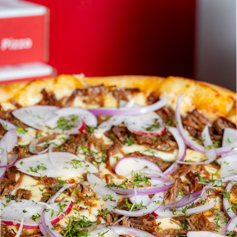 La reina de la casa, variedad de carnes, salami, champiñones horneados, cábano, pollo desmechado, pimentón y cebolla, queso mozzarella, masa tradicional Ziru´s y salsa de la casa.